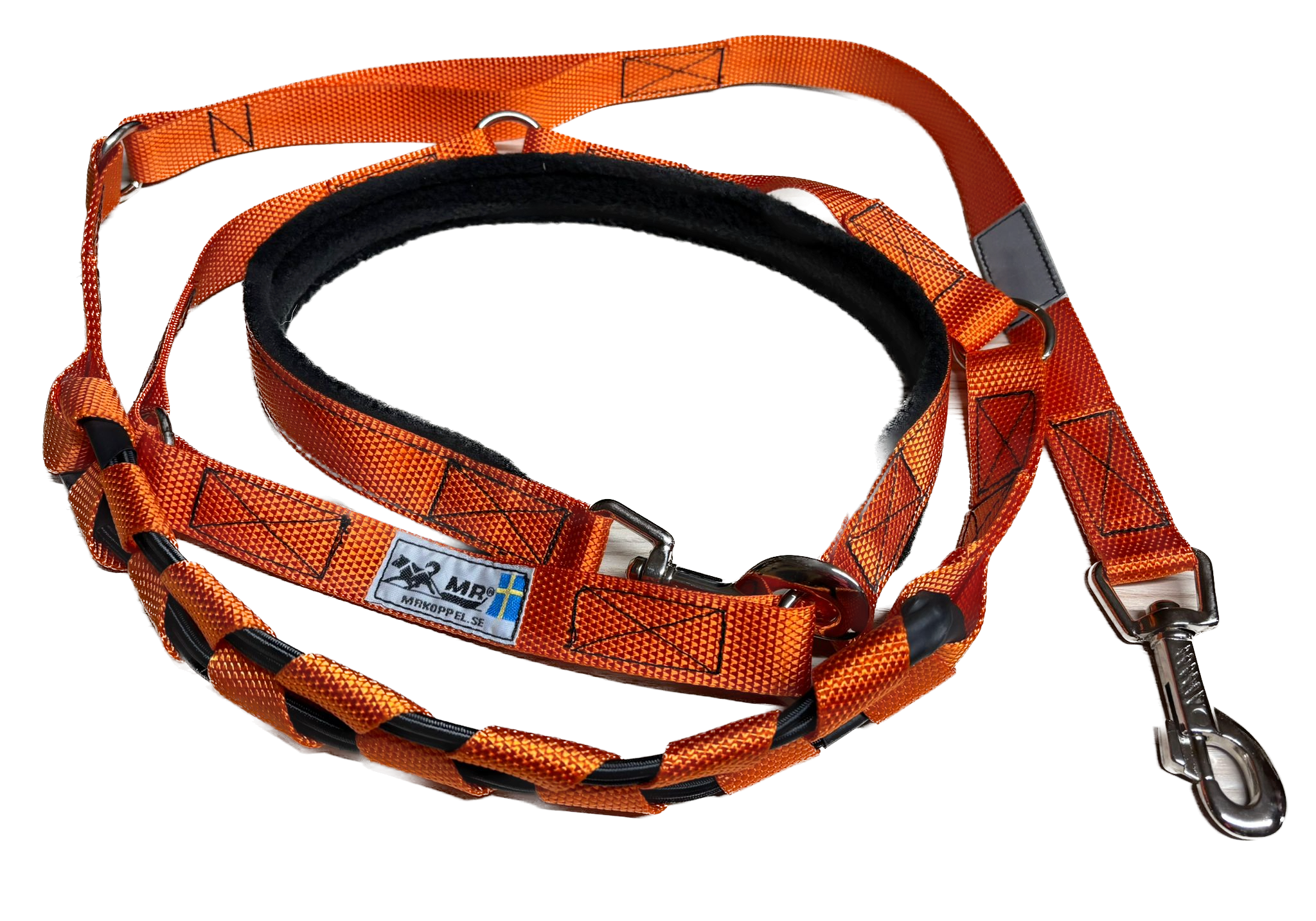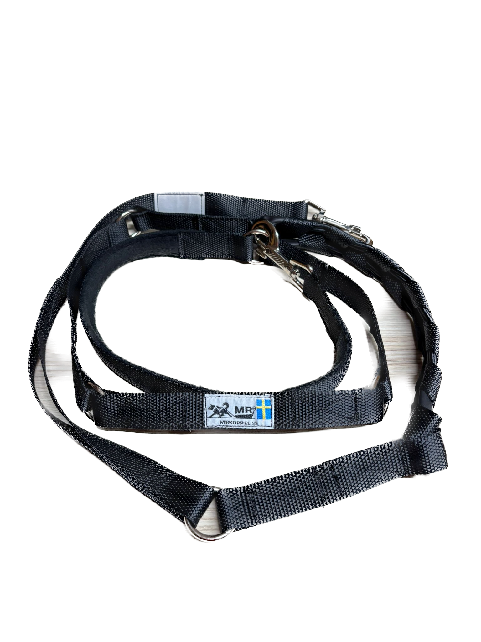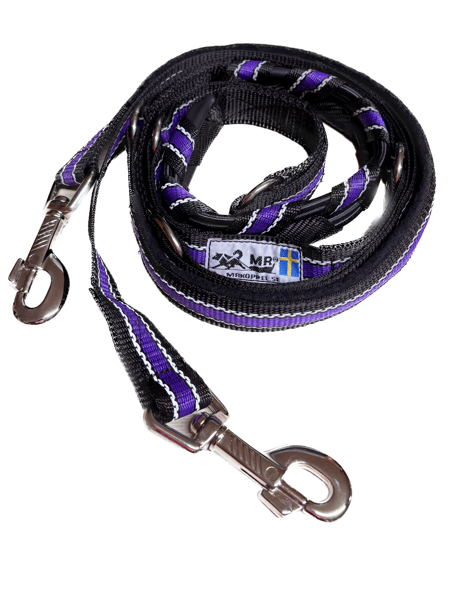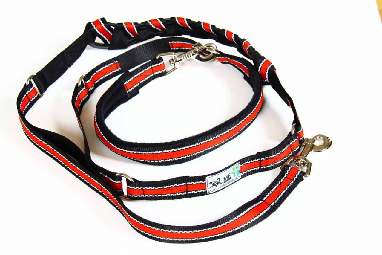 Die MR Koppel Leine ist eine multifunktionale Hundeleine mit einem eingebauten starken Ruckdämpfer. Der Dämpfer ist geeignet für starke oder ziehende Hunde. Die Hundeleine aus Polyesterband ist von einer schwedischen Frau mit nordischen Hunden entwickelt worden und wird heute noch dort von Hand gemacht.