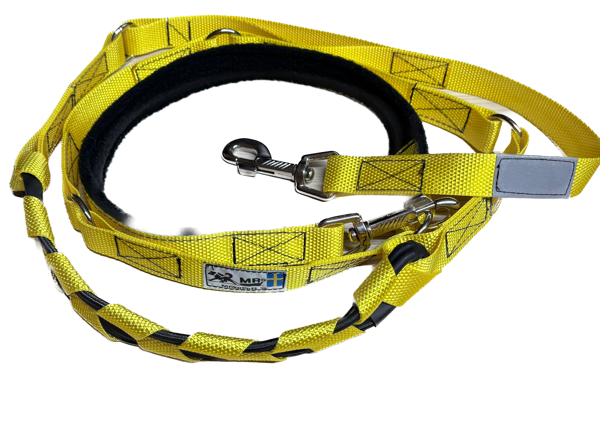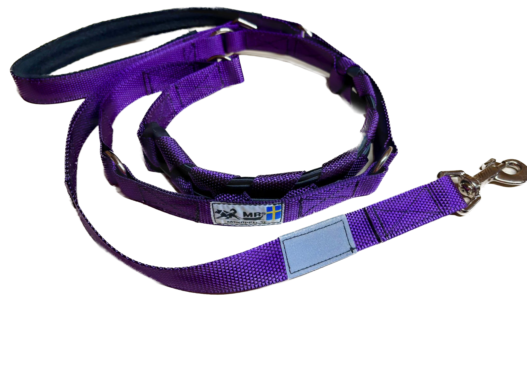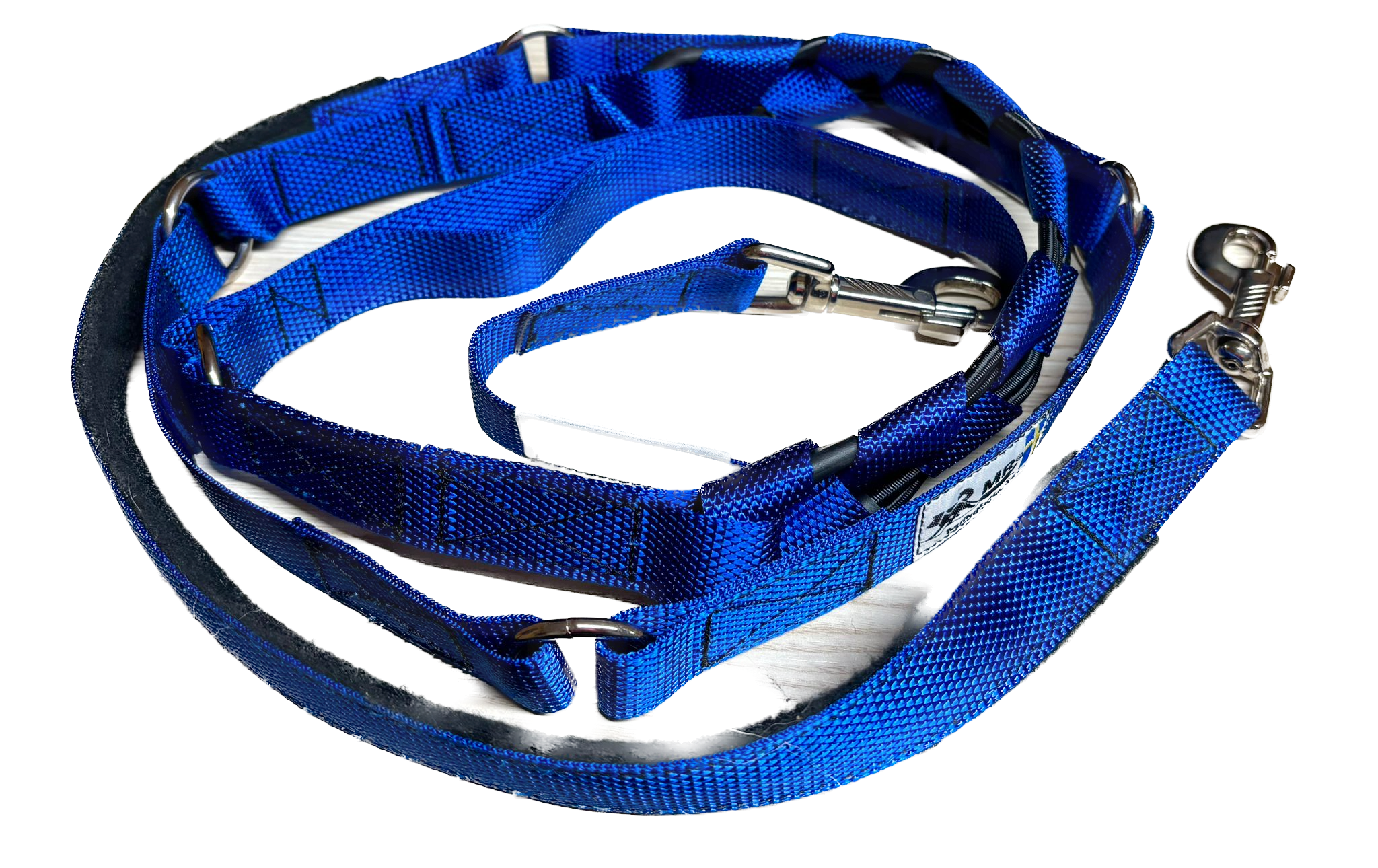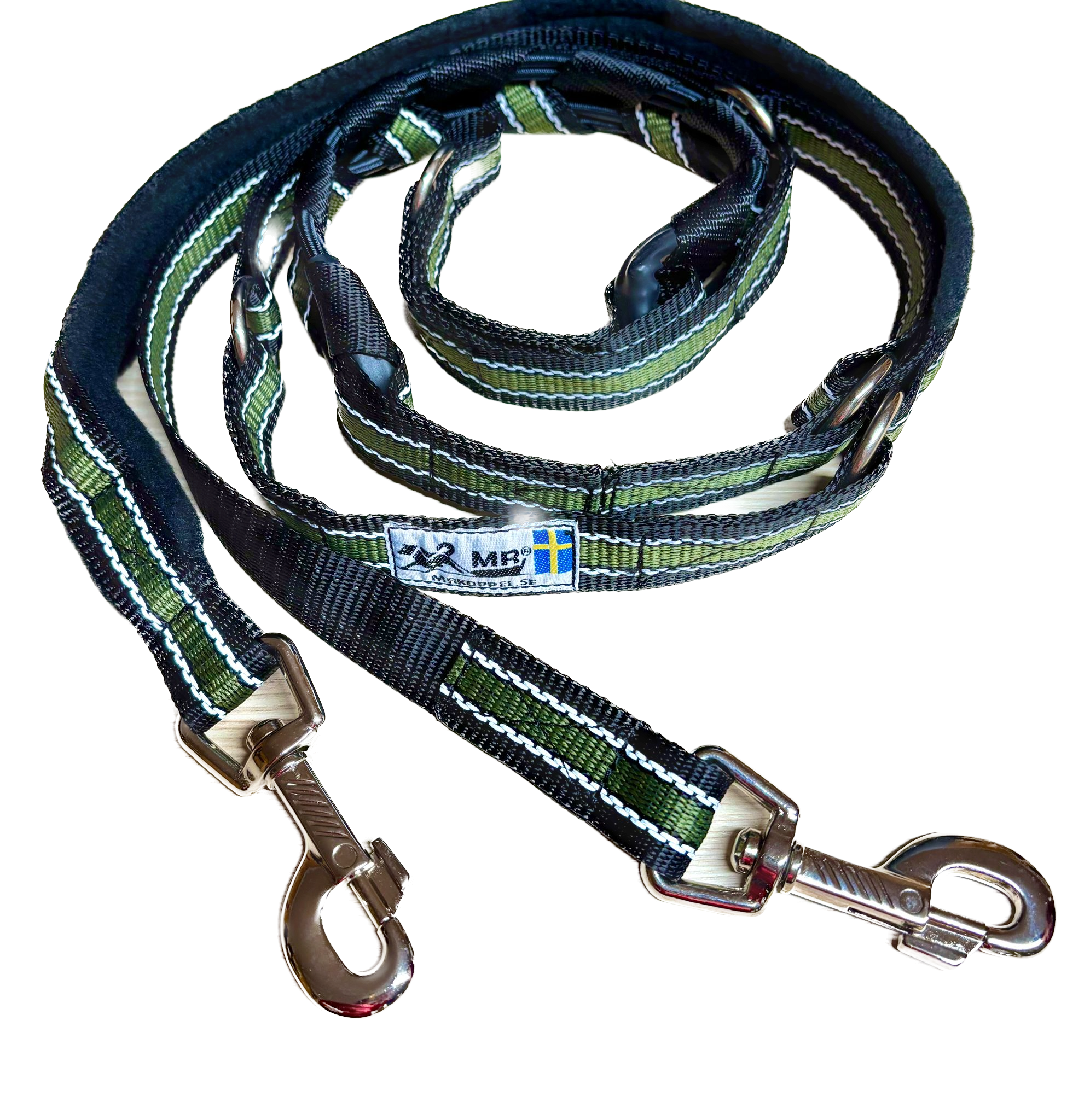 Die MR Koppel Leine ist eine multifunktionale Hundeleine mit einem eingebauten starken Ruckdämpfer. Der Dämpfer ist geeignet für starke oder ziehende Hunde. Die Hundeleine aus Polyesterband ist von einer schwedischen Frau mit nordischen Hunden entwickelt worden und wird heute noch dort von Hand gemacht.
