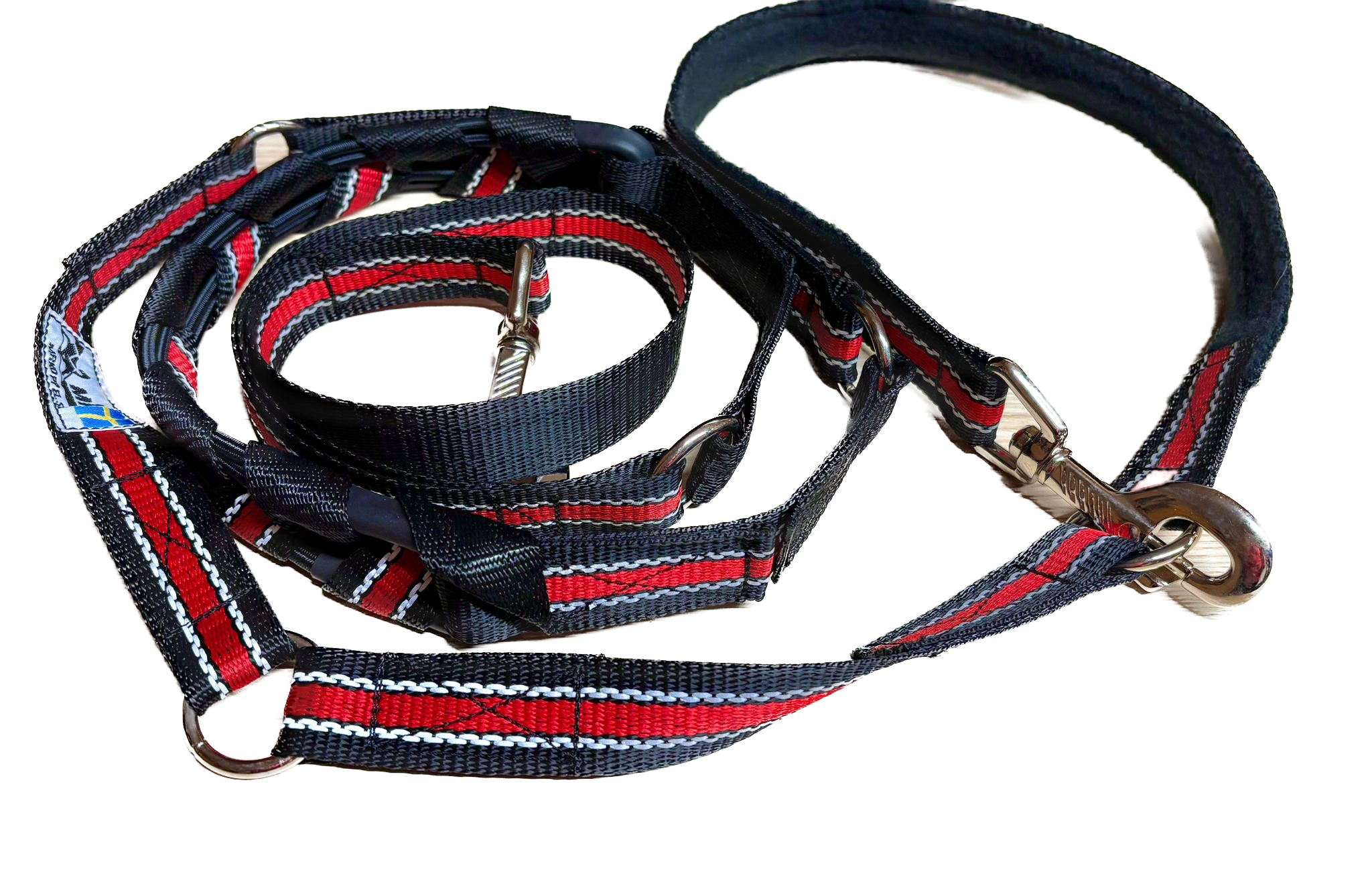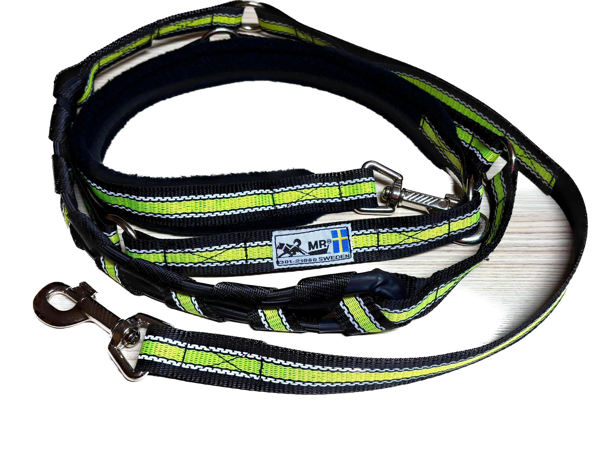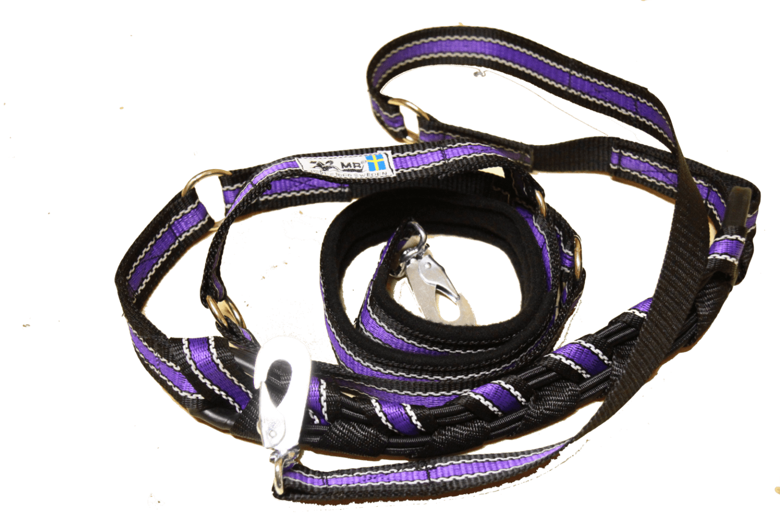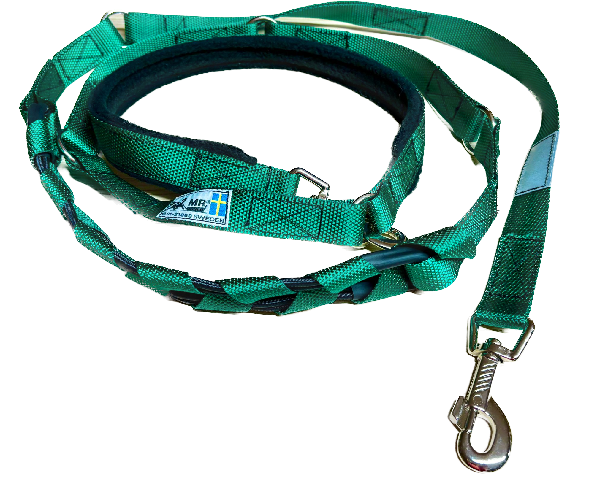 Die MR Koppel Leine ist eine multifunktionale Hundeleine mit einem eingebauten starken Ruckdämpfer. Der Dämpfer ist geeignet für starke oder ziehende Hunde. Die Hundeleine aus Polyesterband ist von einer schwedischen Frau mit nordischen Hunden entwickelt worden und wird heute noch dort von Hand gemacht.